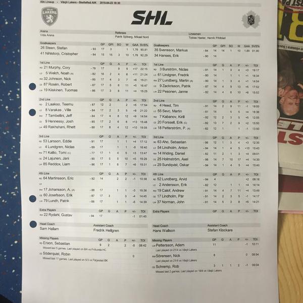 Kul fakta, i Växjös första och andra lina så återfinner vi en svensk.. I Skellefteås första och andra lina så återfinner vi en import.. Hade varit roligare för svensk hockey om Skellefteå vann, de skapar mer för svensk hockey genom att släppa upp juniorer och skapa nya svenska stjärnor. Det är inte en slump att många vill värva från den klubben, antagligen Sveriges bästa hockeyutbildning.