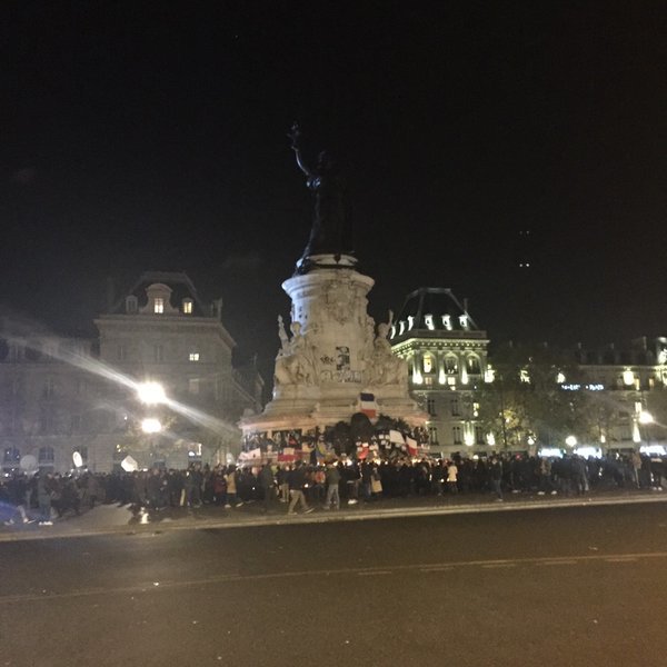 Mycket folk, många familjer med barnvagnar och småbarn, söker efter en plats att ställa ner sina ljus. Statyn har (sedan Charlie Hebdo) blivit ett verkligt altare som man vandrar runt, långsamt. En unga kvinna ritar klart sin affisch: ”Mot döden, levande”. En ung man kliver ut ur folkmassan och börjar applådera vid åsynen av statyn som symboliserar den franska republiken. Efter några sekunders tvekan ansluter sig hela folkmassan till applåderna.Tweeten nedan med en bild från platsen kommer från en annan journalist, på AFP: