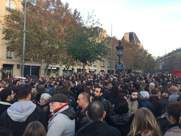 Polis och myndigheter i Paris har uppmanat folk att hålla sig inne och undan i Paris, men många väljer ändå att gå ut och samlas, främst på Place de la République som ligger i samma området där de flesta dåd ägde rum.