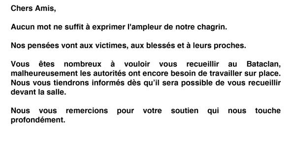”Kära vänner, Inga ord räcker till för att uttrycka storleken av vårt lidande. Våra tankar går till offren, till de skadade och till deras anhöriga. Ni är många som vill samlar vid Bataclan, tyvärr måste myndigheterna fortfarande arbeta på platsen. Vi håller er informerade så fort det blir möjligt att samlas framför salen. Vi tackar er för ert stöd som berör oss djupt.”