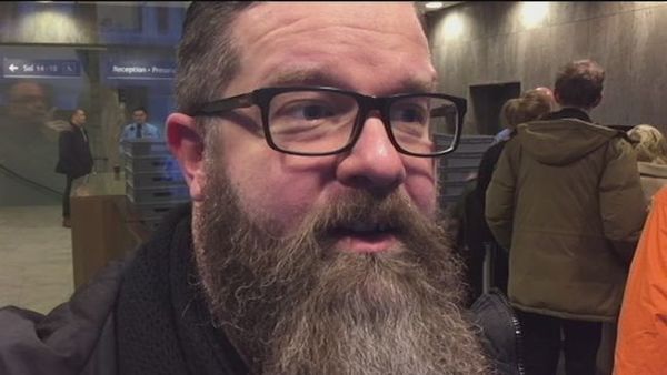 Nu är paus för lunch. Fredrik Önnevall ser lättad ut. Åhörare kommer fram och lägger en hand på hans axel.