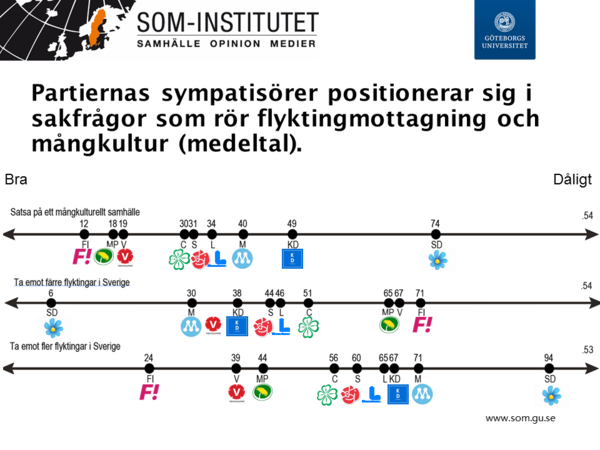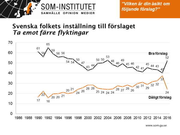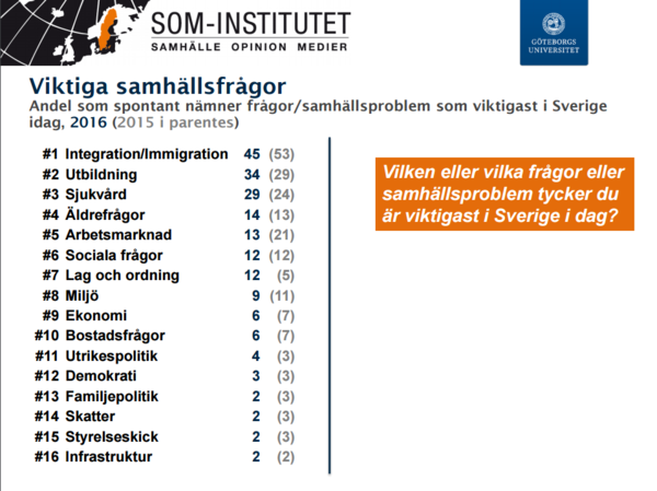 Grafen nedan visar hur frågan om immigration/invandring har klättrat på dagordningen under de senaste tre-fyra åren. Men hösten 2016 hade andelen som nämner en viktig fråga/samhällsproblem som hör till området minskat från 53 till 45 procent. Fortfarande är frågan nummer 1 på svenska folkets dagordning. Dock: Att man tycker frågan är viktig betyder inte nödvändigtvis att man har en stark preferens för/emot t ex flyktingmottagning.