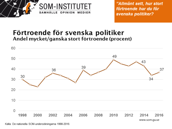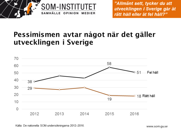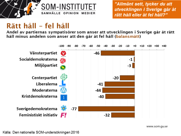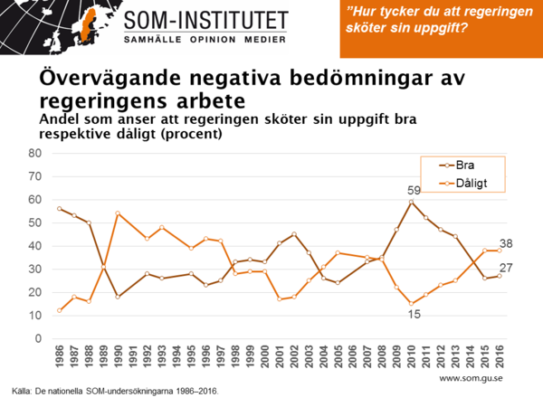 Sköter regeringen sin uppgift? Det brukar vara en bra indikator på om en regering har möjlighet att bli omvald. Senaste SOM-undersökningen visar att regeringens "job performance" är stabil men negativ. 38 procent tycker att regeringen sköter sina uppgifter mkt/ganska dåligt. 27 procent anser att regeringen gör ett bra jobb.