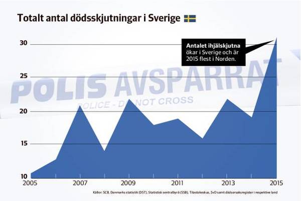 Grafik från SVD - tidningen Svenska Dagbladet skriver i en artikel den 24 feb att polisen 2016 rapporterar om 28 ihjälskjutna. (https://www.svd.se/dodsskjutningar-okar--sverige-sticker-ut-i-norden).