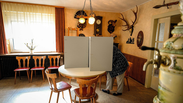 Bild från en vallokal i Breckerfeld i Nordrhein-westfahlen i västra Tyskland. Drygt 60 miljoner tyskar är röstberättigade i dagens parlamentsval. Foto: TT