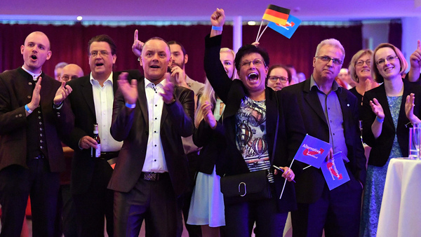 AFD-supportrar jublar efter att en första prognos presenterats kl 18. Om prognosen håller blir högerpopulistiska AFD tredje största parti.Liberala FDP:s ledare Christian Lindner säger att han är öppen för koalitionssamtal med Merkel, men också att det kräver en ny politisk kurs.