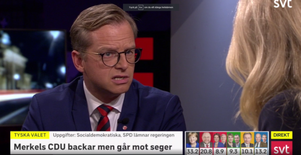 – Det är en stor förändring, mer splittrat politiskt landskap. Bra med Merkel fortsatt förbundskansler. SPD gör det sämsta valet i historian. Jag förstår det emotionella beslutet att gå i opposition. Från allmän europeisk utgångspunkt är det stabilt med Merkel som fortsatt förbundskansler, säger den förra utrikesministern Carl Bildt.