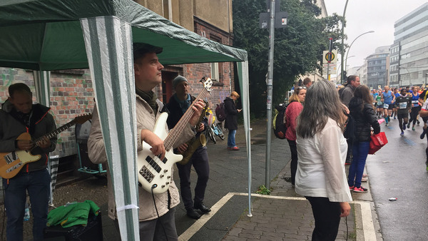 Det är lite av folkfest på gatorna. Här får maratonlöparna underhållning i form av ett band.