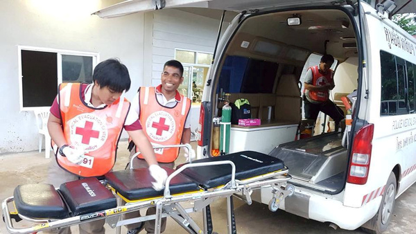 Ambulanserna som väntar på att föra människor som räddats till sjukhus.Vildsvin är namnet på fotbollslag.