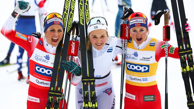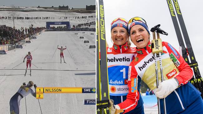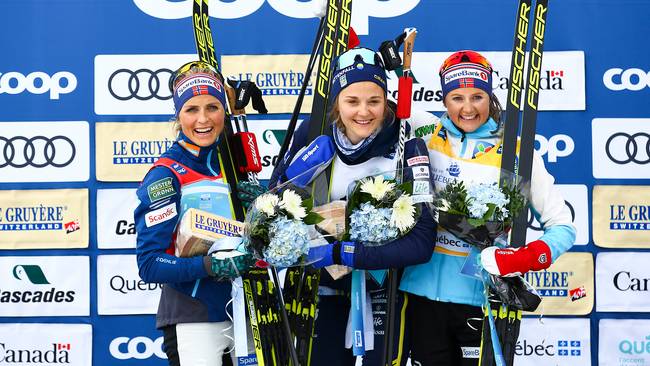 SVT SportStina Nilsson stod för en fenomenal insats i det tio kilometer långa masstartsloppet i Québec. Hon utmanade ”omöjliga” Therese Johaug och vann spurten. Det var första gången i år som Therese Johaug förlorade ett distanslopp. – Jättekul att göra det när hon varit helt ostoppbar, säger Stina Nilsson i SVT:s sändning.Både Anders Blomquist och Jacob Hård tror att Stina Nilsson kommer att hålla ut och inte låta Östberg och Johaug komma ikapp. Östberg startar 33 sekunder efter och Johaug 49 efter.