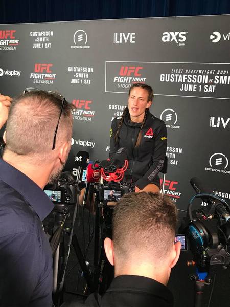 Bea Malecki pratar med media efter segern.Vilken tid ungefär kommer Gustafsson fajtas?