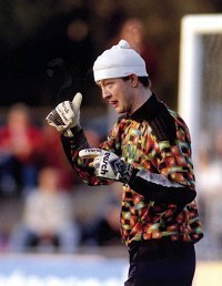 Klassisk bild från 1992. Färöarna fick inte lira hemma och mötte därför Österrike i Landskrona! Och vann!Skulle säga så här: Om den där mössan åker på – då ändrar jag mitt slutresultat till 2–1 till Färöarna. Nu är det upp till målvakten hur han vill ha det.