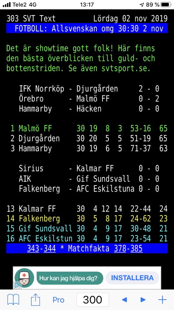 Tabelläget just nu. Men cirka 20 minuter kvar. Djurgården i serieledning och svenska mästare.