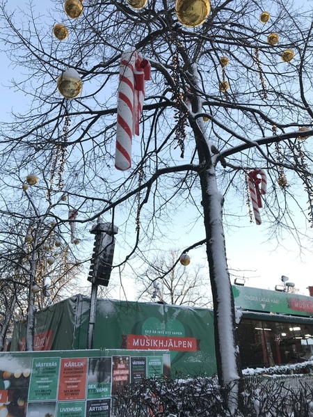 Musikhjälpenområdet har dekorerats med bland annat stora polkagrisar och belysning i olika slag.Vivianne och hunden Frasse har åkte från Stockhom för att hänga i Västerås hela veckan.