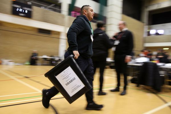 Nu är rösträkningen i full gång och lådor med röster förs hastigt till rösträkningscentralerna.