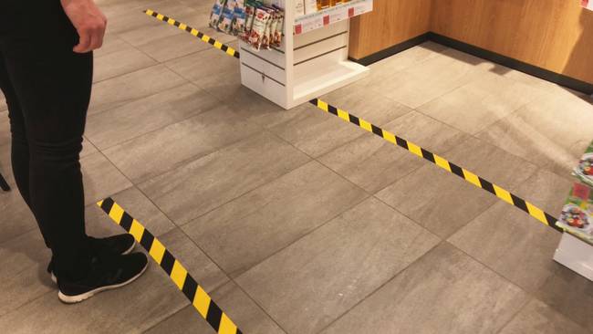 Apoteken skyddar personalen – tejpar upp avståndsmarkörer