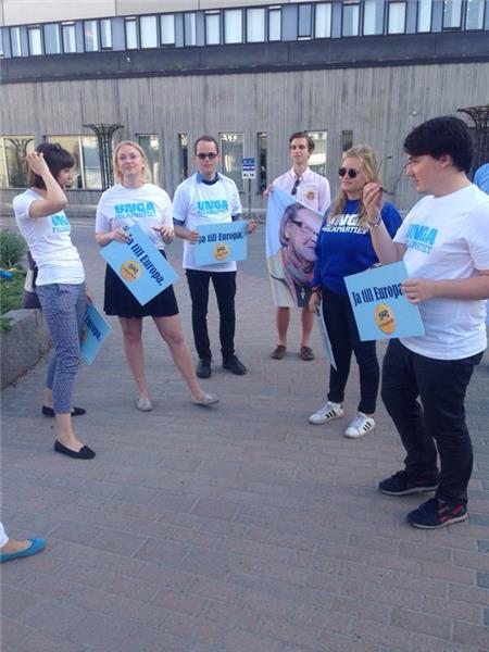 Stort tryck när Gunnar Hökmark anländer till TV-huset. "Finns bara en Gunnar Hökmark" , "Vi älskar Gunnar och Gunnar älskar oss" sjunger ystra ungmoderater.
